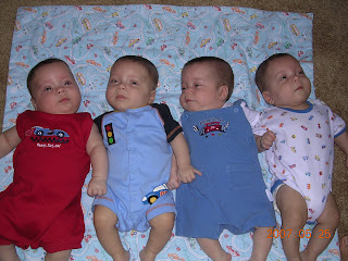 Brad & Jen – got your postcard in the mail. So incredibly precious! I even told my mom about it and she can’t wait to see it too. I will definitely send you guys another renewal form for the group. I’ve enjoyed catching up on you guys. It sounds like the boys are doing wonderfully. I can’t believe how big they are!!! My smallest (3 lb 5 oz) didn’t reach 20 lbs. until she was 1 1/2 years old and your boys will probably beat her!!! Good for them!!! You guys are doing wonderfully. The pictures are adorable – I don’t know HOW you tell them apart!! I know only two are identical but they all look alike to me… I’m glad you are able to smile and see the good in all the craziness. I had many smiles on my face reading about your adventures with them so far. We look forward to having you in the group again and really look forward to meeting you all in person. I’m so glad everyone is doing well. Julie Burgess