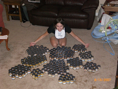 After getting this deal and telling a few people about it, we had a couple other friends volunteer to hit other Target stores for us to try to get more on this deal. The coupon expired yesterday, so we had to get it before the store closed yesterday. This morning, I found out that Judy (our secretary here at work) and Jayson and Jenn (friends) managed to pick up a total of 234 additional jars of baby food for us. This brought our grand total to 513 jars of baby food, and almost all of it was 2 cents per jar!!