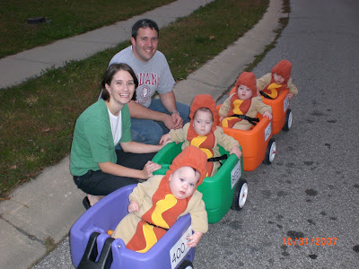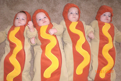 Now that’s a foot long hotdog!!!!! HOW SWEET!!!! I think those costumes were put there just for Brad to grab! Couldn’t have been any cuter!!! Glad you made their 1st Halloween so memorable – – needed that laugh first thing in the morning too! 🙂